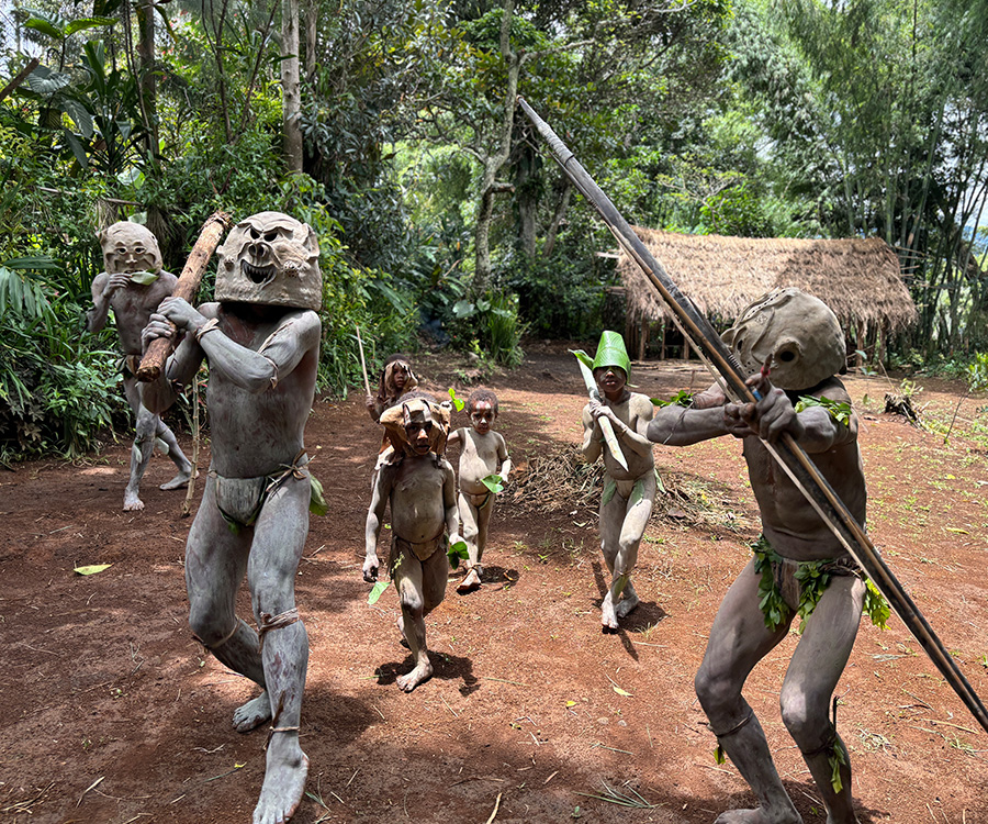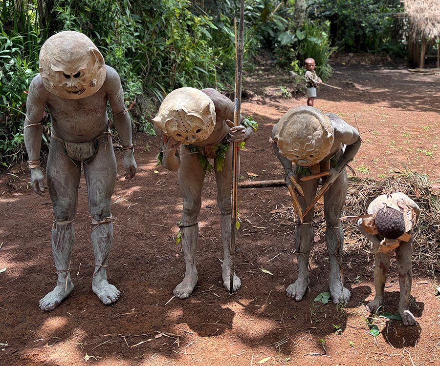 粘土や石など身近にあるもので恐ろしい仮面を作ることで、村を敵から守るのだ。